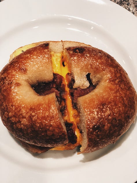 To this rotation, in high school years, was added the iconic $2.50 bacon egg & cheese on a roll, the delectable sausage egg & cheese on a cinnamon raisin bagel, the refined toasted & buttered sesame seed bagel, or the rarified scallion cream cheese on toasted everything. These delights were inhaled half-dressed, standing while scrambling through unfinished homework, swaying between strangers on bus and subway, in motion as I trudged through my prep school’s doors, more often than not, alone.